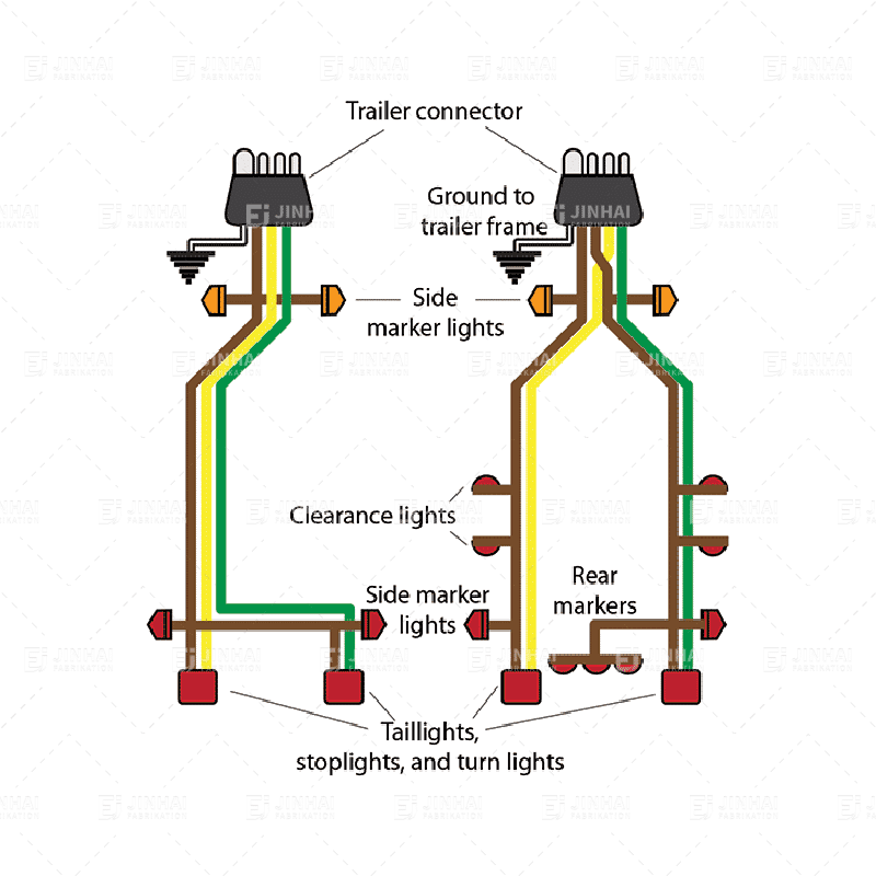تضمن أحزمة توصيل أسلاك المقطورة النقل السليم للإشارات بين السيارة القاطرة والمقطورة، بما في ذلك مصابيح الفرامل وإشارات الانعطاف والأضواء العكسية. تستخدم أحزمة الأسلاك من JinHai مواد واقية من مادة PVC المقاومة للتآكل وأطراف نحاسية معلبة. وهي تتوافق مع معيار SAE J1128 وتتوافق عادةً مع أنواع مختلفة من الموصلات، بما في ذلك الموصلات ذات 4 و5 و7 سنون.